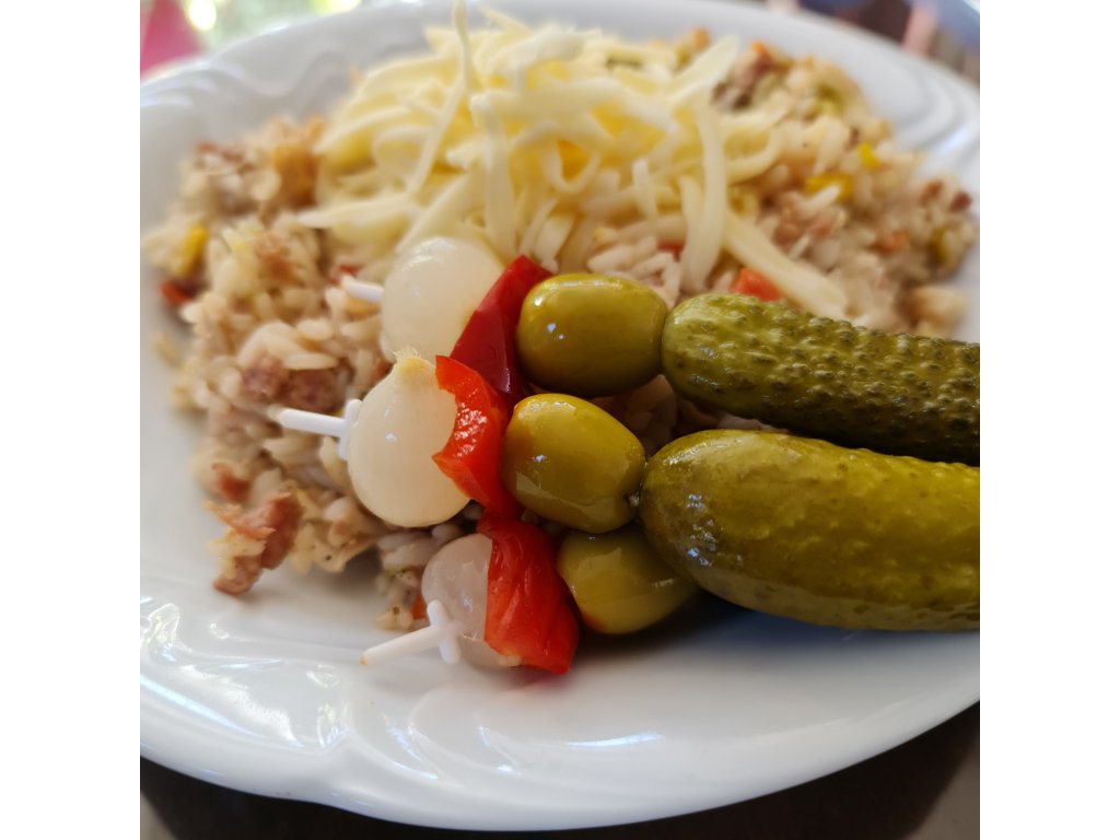 Složení: oliva bez pecky, okurka, cibulka, červená paprika, voda, sůl, ocet, antioxidanty E300, Může obsahovat stopy siřičitanů!, E211, E202